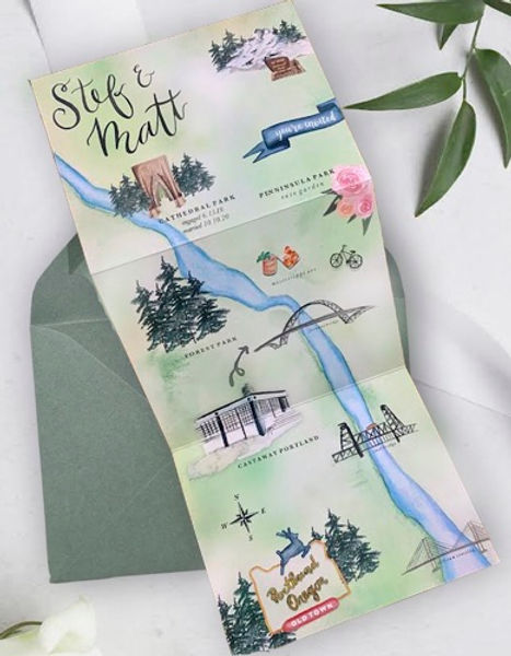 your guests where they're going by including a custom watercolor map in your Save the Date or in your invitation suite!